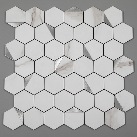 PVCアルミニウム六角形ホワイトシルバーバックスプラッシュピールアンドスティックバスルームタイル自己粘着タイル